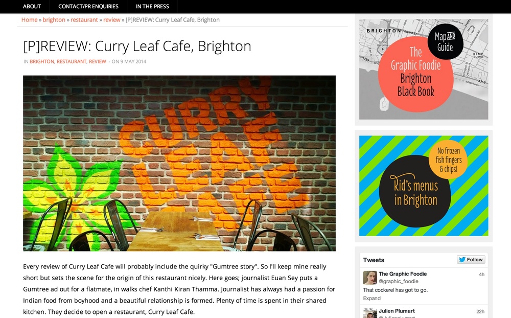 euan sey May 18, 2014 A review by The Graphic Foodie euan sey May 18, 2014 Food blogger TheGraphicFoodie pays a visit to Curry Leaf Cafe. Read her verdict online here